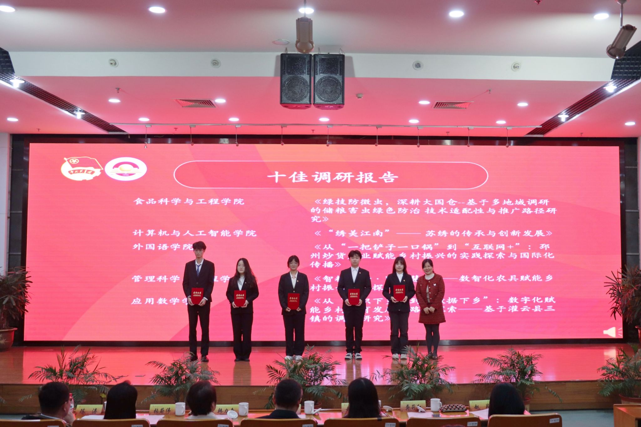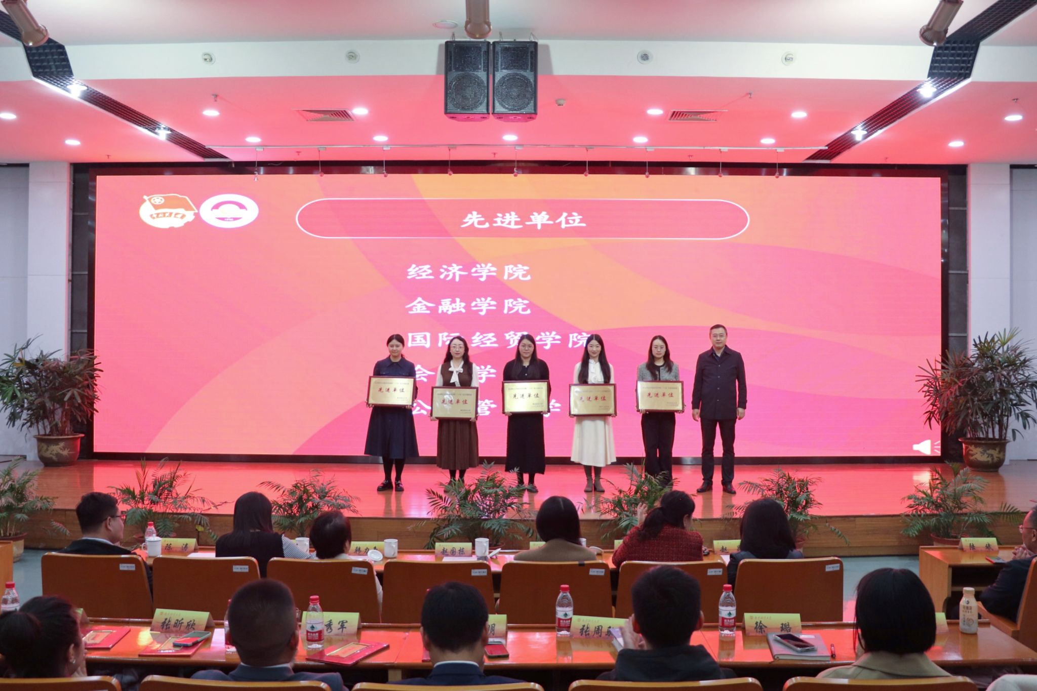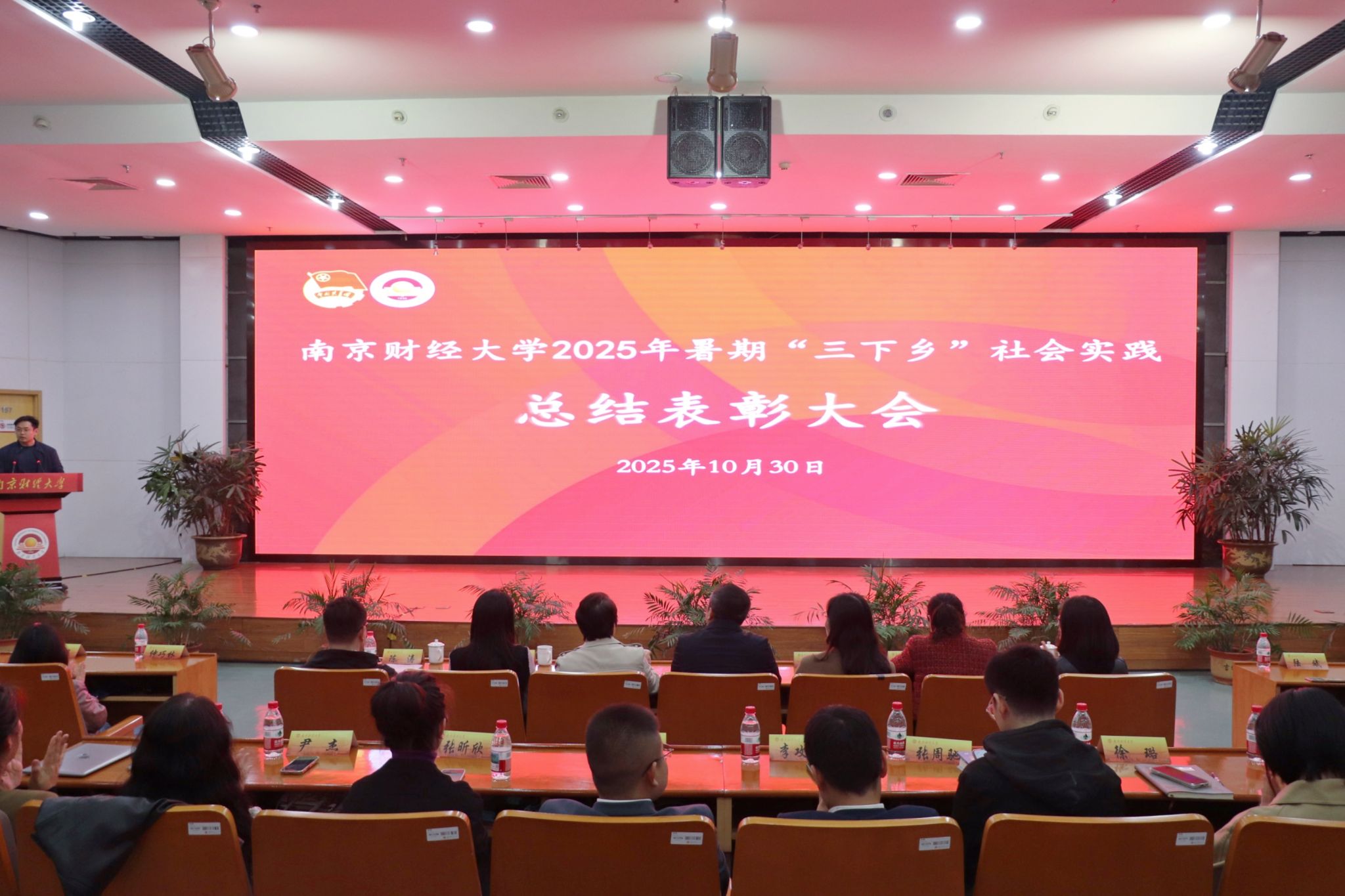 张蔚伟书记宣读《关于表彰南京财经大学2025年暑期文化科技卫生“三下乡”社会实践活动先进集体和先进个人的决定》。经济学院、金融学院、国际经贸学院、会计学院、公共管理学院获评“先进单位”;财政与税务学院、工商管理学院、应用数学学院、管理科学与工程学院、新闻与文化传播学院获“宣传成果奖”;经济学院潘怡老师等10位老师获评“十佳先进工作者”;财政与税务学院“星火传承,津门红钥”团队等10支社会实践团队获评“十佳团队”;金融学院高欣语等10名同学获评“十佳个人”;经济学院《智水润蟹乡,数字促振兴:数字技术如何照亮五类养殖主体的“新渔路”——基于四省10市的调研》等10个调研报告获评“十佳调研报告”;金融学院狄锦文等10名同学获评“十佳通讯员”。
