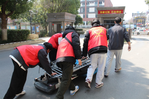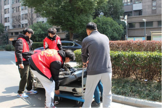 图为志愿者协助社区工作人员搬运设施 吉周蓁摄