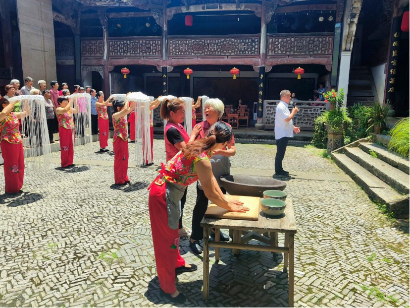 “只要大家想听,我就会一直唱下去。”在汪氏宗祠,小队成员结识了大陈古村“村歌文化”的主要发起人和传承人——汪衍君。这位曾带领181名大陈村村民为新中国七十周年华诞献礼的 “十八岁”村党总支书记,在台前献唱表演时,有着十足的精气神。“轻轻的在风中翻转,香香的在碗中盘旋;美美的和着我们欢笑,那芳香诱人的大陈面……”一曲《妈妈的那碗大陈面》,汪衍君歌喉嘹亮,情感真挚,把离家孩子与留村母亲间血浓于水的温情生动淋漓地展现在观众面前。汪氏宗祠,不仅是大陈村民乡情信仰的现实寄托,也是大陈古村家风底蕴的生动载体;大陈村歌,不仅唱出大陈老少的寸草春晖,更唱出全天下家庭的至亲至情。