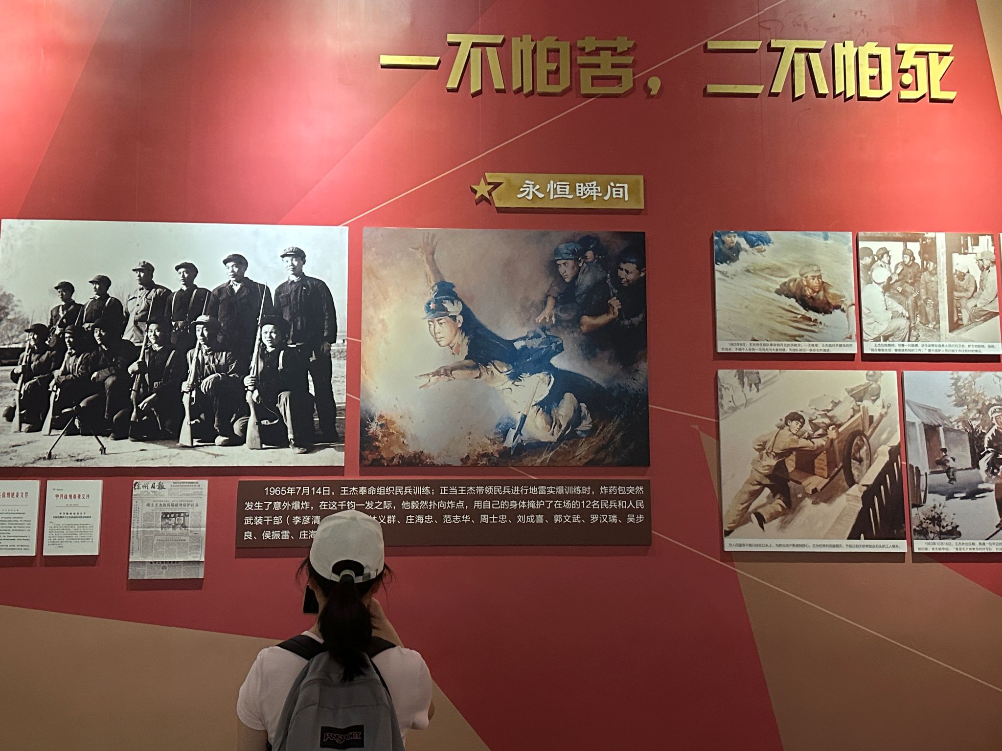 7月22日,团队在淮海战役纪念馆及双拥展览馆内,通过历史文献与实物展品回溯战役历程,重点学习了爱民模范王杰的事迹。1965年7月14日,23岁的战士王杰在训练中为保护12名战友,毅然扑向即将爆炸的炸药包,壮烈牺牲。其“一不怕苦、二不怕死”的战斗精神,忠诚于党、服务人民的信念,以及爱岗敬业、甘于奉献的品质,被概括为“王杰精神”,成为激励后人的精神标杆。