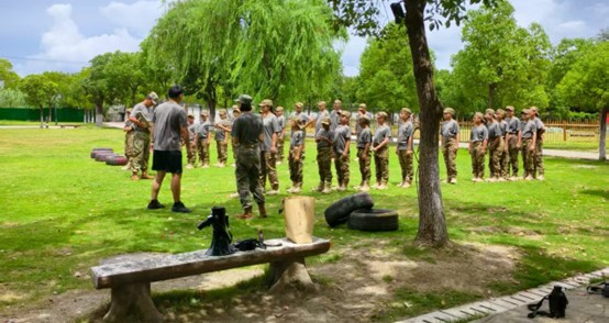 在相邻的夏令营训练场上,沙家浜芦荡尖兵军事夏令营的小学员们正跟随教官指令,全神贯注地进行匍匐前进等基础战术训练。稚嫩脸庞上透出的坚毅神情,深深触动了实践队队员,也让他们回想起入学军训时的汗水与收获。眼前场景生动印证了沙家浜国防教育园寓教于“行”、深耕青少年国防教育的良苦用心。