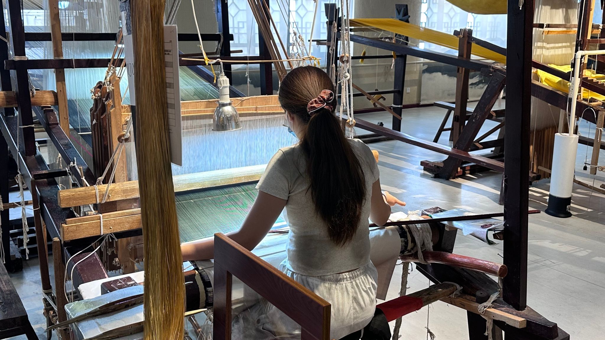 通过近距离观察大花楼木织机的织造过程,团队成员对云锦的精湛工艺和独特艺术风格有了直观的感受。木机高四米,两人一上一下,一分钟仅织出1厘米。隔着安全线,团队成员们屏息凝视:梭影翻飞,一寸锦一寸心,古人千锤百炼的匠心此刻具象化。