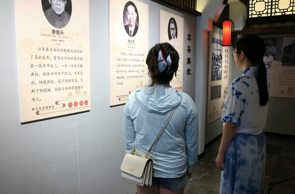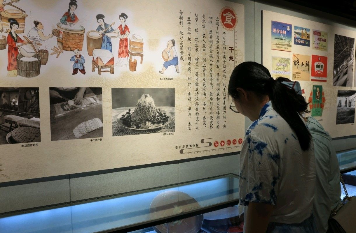 在泰州早茶博物馆,实践团成员驻足于泛黄的文字展板前。唐鲁孙笔下“酥脆绵软”的鳝鱼脯、梅兰芳故乡早茶里“清鲜淡雅”的烫干丝,随着讲解在眼前铺展开一幅味觉长卷。“千丝细如发,高汤润古今”,展板上干丝制作的手绘插画,从选豆、煮浆到切丝、调味,还原传统技艺的细腻。成员们俯身端详老照片里的茶肆烟火,触摸“早茶兴城”的历史脉络--这不仅一日之晨的饮食仪式,更是泰州人慢生活哲学的载体。