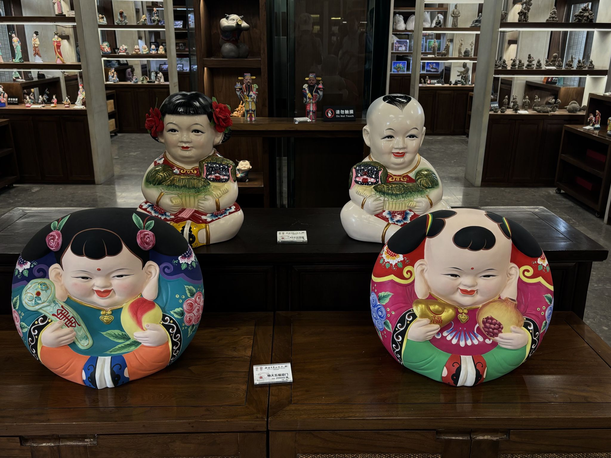上午,成员们在非遗讲解员王杰的带领下参观了各式各样栩栩如生的泥人。从最早单一色调的惠山泥人到多姿多彩的泥人群像,从明艳张扬的仕女泥人到优雅亭亭的现代泥人,从活灵活现的戏曲泥人到可爱生动的卡通泥人……憨态可掬的阿喜,手捧寿桃,向成员们展现长寿安康的美好祝愿;圆头圆脑的阿福,手握元宝,向成员们传递财源滚滚的真诚祝福;有卧,有坐,有单个,有群像,有老,有少等等,让成员们目不暇接,感受到惠山泥人的多姿多彩,手工艺人丰富的创造力。