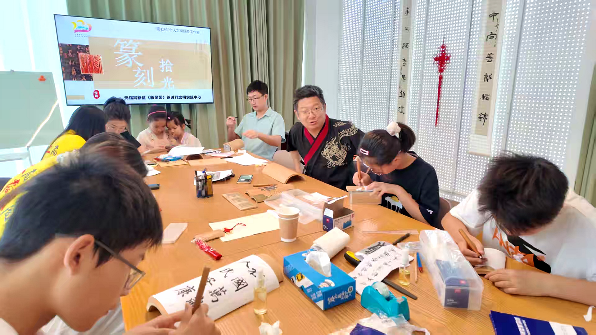 图为“青刻竹韵”团队成员与学生一起体验非遗竹刻 谢雨婷 供图