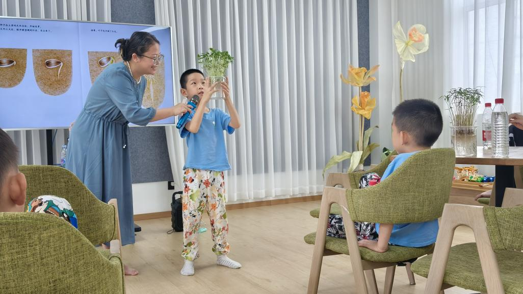 为让孩子们理解节气与农耕的关系,志愿者们给小朋友们分发了种子,有经验的小朋友自告奋勇,分享水培播种的经验。