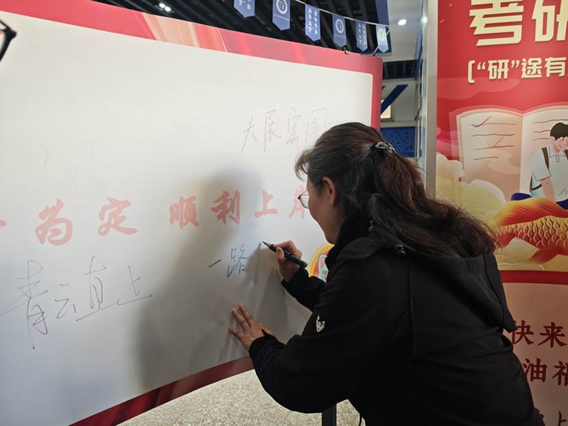 “学长学姐,祝你们成功上岸、未来可期!”祝福声此起彼伏,温暖了紧张的备考时光。暖心驿站的留言板上,密密麻麻的签名与真挚的寄语交织,化作一面闪耀的“奋斗宣言墙”,定格下师生同心、同窗共勉的动人瞬间。