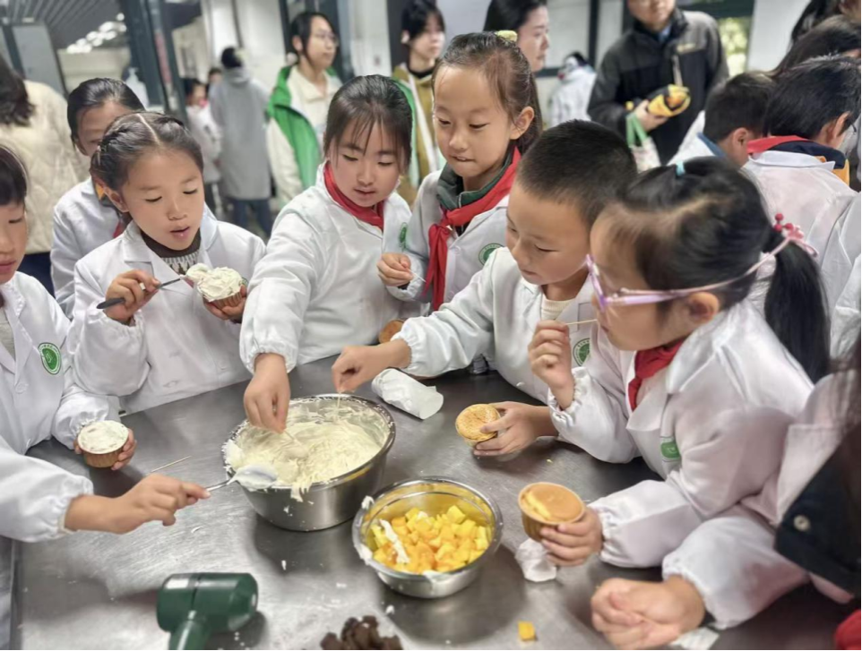 在实践体验环节,食品科学与工程学院志愿者化身“指导老师”,带领学生分组协作完成美食创作。制作前,志愿者通过动画短片展示小麦从播种到加工成面粉的全过程,详细讲解黄油、鸡蛋等原料的生产周期与资源消耗,让学生深刻认识到“每一份食材都凝结着自然馈赠与人类劳动”,读懂 “浪费食材就是浪费资源” 的深层含义。