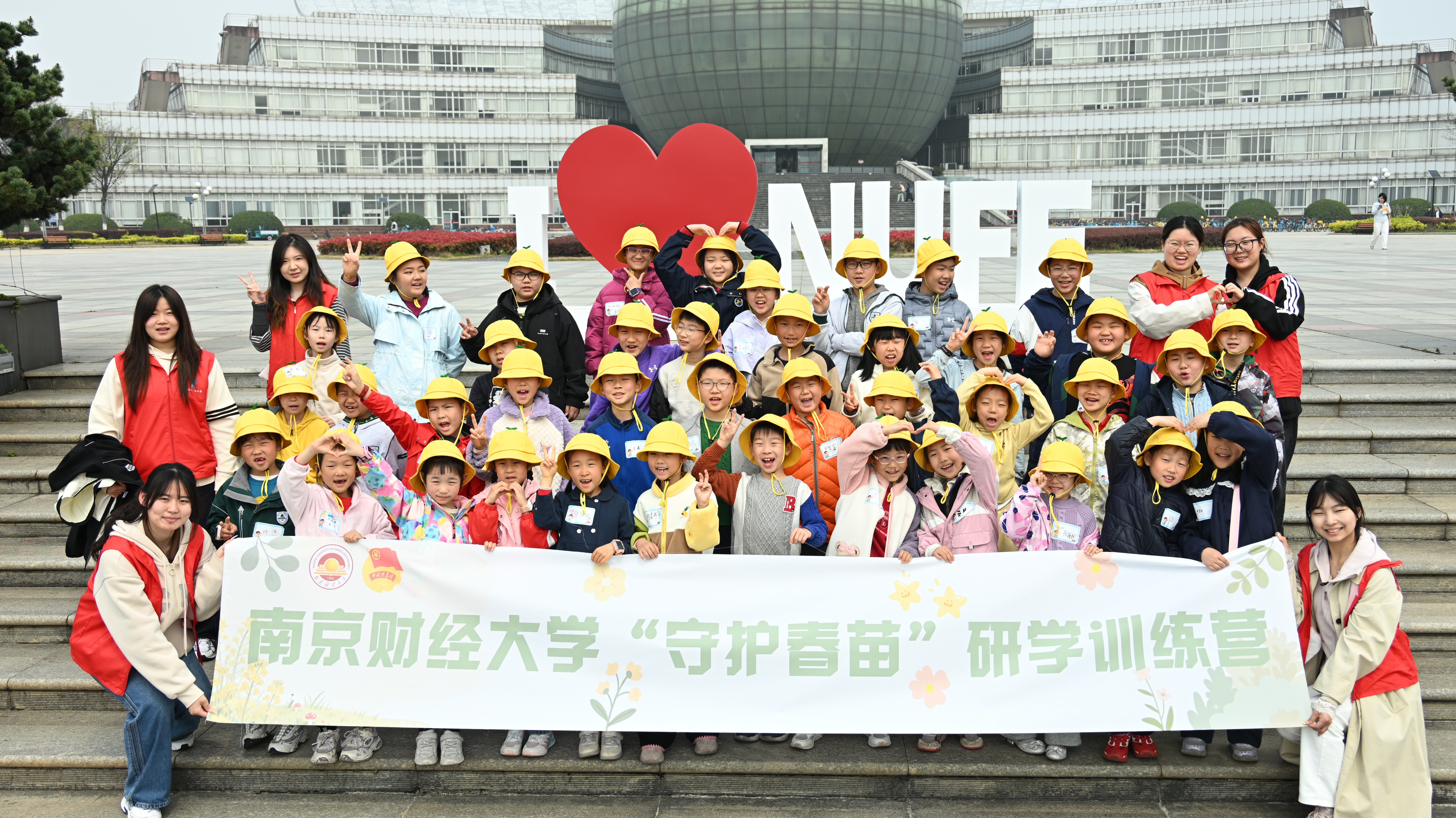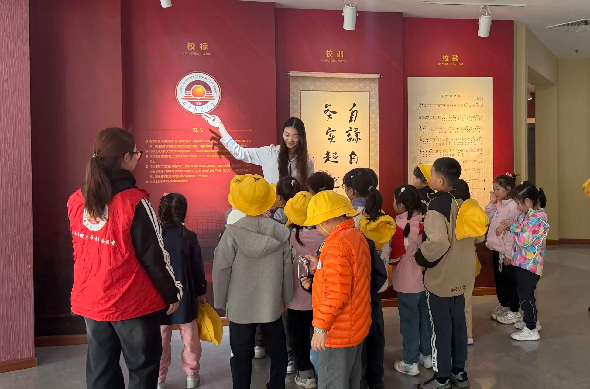 走进校史馆,“小老师”轻声讲解着学校从粮食部南京粮食学校、南京粮食经济学院到南京经济学院、南京财经大学的三次历史性飞跃,孩子们听得目不转睛。玻璃展柜里,锈迹斑斑的老教具、泛黄的《学生手册》、写有“南京财经大学<筹>”字样的录取通知书,还有校友捐赠的珍贵校史档案,无声诉说着南财七十载的岁月沉淀。墙上的学科布局图灯光缓缓亮起,“小老师”用通俗易懂的语言,讲解着学校在粮食安全、财经研究领域的突出成就,孩子们一边认真聆听,一边时不时驻足凝视,有的还用小手轻轻触摸展品的玻璃罩,眼神里多了几分理解与骄傲,不仅对父母的职业有了更深刻的认知,也对这所充满财经底色、粮食特色的大学多了一份向往。