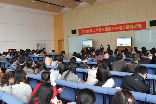 2013年4月24日下午,由我校研究生会举办的财经论坛系列活动之巅峰对话在图书馆四楼世界之窗举行。研究生会荣幸地邀请到了中国建设银行南京审计部审计五处处长严胧和我校金融学院院长闫海峰教授做为特邀嘉宾,为即将踏入工作岗位的大三和研二学生做了一次生动而难忘的演讲,并在交流互动中提出了中肯的建议。
