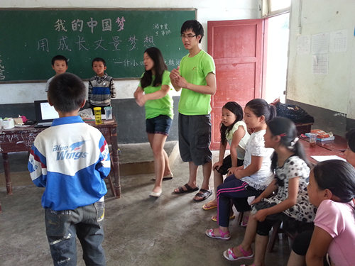 上午九时,以班为单位的主题班会正式开始,本次班会均已“我的中国梦”为主题,包括六年级“我的未来不是梦”主题班会,五年级“把握青春,拥抱梦想”主题班会,四年级“用成长丈量梦想”主题班会等。各年级志愿者首先通过有趣的自我介绍、游戏、才艺展现、团辅等一系列活动让同学们能够更好的融入整个班级;其次再通过一系列故事的讲述、辅以自身经历的情景再现让山区孩子了解什么是中国梦,以便从小树立坚定的梦想,让他们以一种积极、乐观、自信的态度朝着自己的梦想出发。活动中,孩子们热情参与、积极展示才艺,让志愿者们在捧腹之余感到欣慰是,相对困乏的物质环境并没有折断孩子们追逐梦想的双翼。