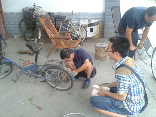 一进仙林新村组员们就被其干净整洁的道路环境而震撼,看到大门旁的一位叔叔在认真的修理自行车,一位组员就体贴的给他递上一瓶水。后来的谈话中组员们得知马师傅是在城镇化之后,凭借原来的住房在仙林新村分到了3套房子,但是他自己比较勤劳,仍然每天按时出摊修理自行车,凭借自己的手艺吃饭,也方便了小区的其他住户。告别时马师傅感慨道,现在干净的地面,方便的就学条件,快捷的交通系统,都是以前想都不敢想的,感谢政府的英明决策。