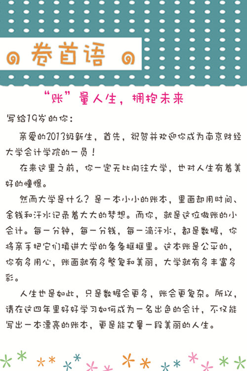 南京财经大学会计学院资产评估2013级新生李骁原,在新生教育的班会上获得了一个特殊的账本。小账本封面上写着“账量人生”四个字。