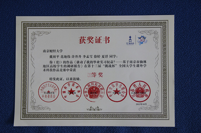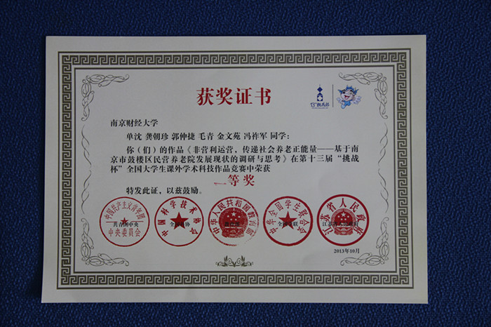 近日,由共青团中央、中国科协、教育部、全国学联、江苏省人民政府主办,苏州大学和苏州工业园区管委会共同承办的第十三届“挑战杯”交通银行全国大学生课外学术科技作品竞赛决赛在江苏省苏州市落下帷幕。通过作品展示、评委问询及竞赛评审委员会认真、细致、公平、公正的评审,我校参赛的两件作品《非营利运营,传递社会养老正能量——基于南京市鼓楼区民营养老院发展现状的调研与思考》(指导老师:张国军;团队成员:单沈,郭仲捷,龚朝珍,金文苑,毛青,冯祚军)、《谁动了我的毕业实习权益?——基于南京市仙林地区高校学生的调研报告》(指导老师:焦富民,陈红梅;团队成员:戴羽平,范地伟,许丹丹,李孟雪,许婷,夏洋)分别荣获全国一等奖和三等奖。在入围全国决赛的27所财经类高校中名列前茅,也是我校自参加该项赛事以来取得的最佳成绩,实现了该项赛事成绩的历史性突破。