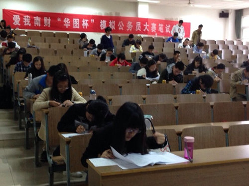 此次大赛共分为笔试和面试两个环节。在校团委、财政与税务学院的密集宣传下、各兄弟院系的大力支持下,有近百名同学参加了11月3日在教C楼进行的笔试。笔试严格按照国家公务员考试的要求,上午是行政职业能力测验,下午是申论考试。11月3日天气比较阴冷,但参加考试的同学们还是早早来到考场外等待进场,笔试现场气氛紧张而有序。整个考试过程中,考生们认真做答,严格遵守了考场纪律,确实将此次模拟大赛视为一场难得的练兵机会。