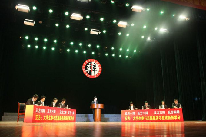 经过近两个月的初赛、复赛激烈角逐,经济学院和法学院过关斩将,最终会师决赛。他们围绕“大学生参与志愿服务应不应该折抵学分”这一辩题展开激烈辩论。正方经济学院代表队从大学生的角度出发,从志愿服务抵扣学分有利于大学教育的日益完善、学生综合素质的提高,能激发学生的志愿服务精神、引导更多大学生走上志愿服务岗位等方面分别展开阐述;反方法学院代表队则结合“汶川大地震”等具体事例,指出志愿服务折抵学分与志愿精神相违背,将导致志愿服务的形式化。双方辩手你来我往,随机应变,旁征博引,互不相让。随后的质辩环节和自由辩论环节更是将赛事推向高潮。在总结陈述环节,反方法学院指出正方是在混淆主体,只指出大学生教育而没有突出志愿服务,正方则坚持通过正确的引导,大学生志愿服务折抵学分同样可以在实现自身利益的同时体现社会价值。双方辩手你来我往,争锋相对,唇枪舌剑中摩擦出智慧的火花,思维的碰撞里闪耀着绚丽的华彩,辩手的精彩表现不时赢得观众的热烈掌声。