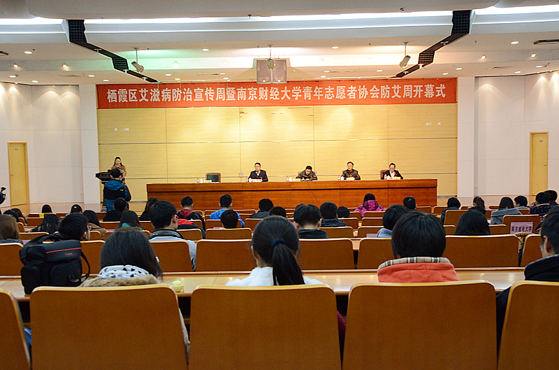 为提高大学生防艾意识,普及艾滋病知识,在第26个“世界艾滋病日”到来之际,11月27日中午,栖霞区艾滋病防治宣传周暨南京财经大学防艾宣传周系列活动在我校仙林校区图书馆报告厅开幕。本次活动由栖霞区卫生局、校团委、校医院、栖霞区红十字会主办,校青年志愿者协会承办。栖霞区卫生疾控中心、校医院、校团委、栖霞区红十字会相关负责人出席了开幕式。
