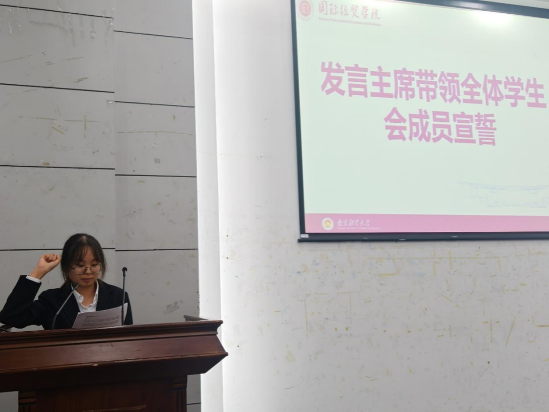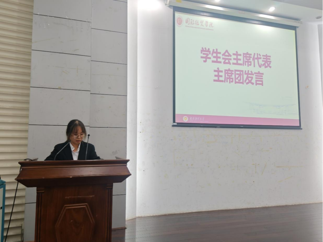 学生会主席董苏红在发言中,首先向国际经贸学院团委老师及新老成员致谢,随后立足职能定位,明确学生会服务同学、锻炼自我的宗旨和连接学校与同学的桥梁定位,为后续工作锚定方向。围绕这一宗旨与定位,董主席具体提出未来工作三大发力点:一是强化协作,以精诚团结打破部门壁垒;二是聚焦实效,坚持求真务实;三是做好表率,树立良好形象。同时也向全体成员发出倡议——永葆工作热爱、深入同学倾听心声、勇于担当责任;最后展望未来,表示将带领学生会在学校与团委支持下书写新篇,并向指导老师、全体同学及学生会自身送上诚挚祝福。